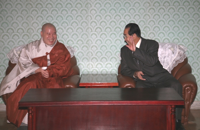 조계종 총무원장 자승스님(왼쪽)과 심상진 조선불교도연맹 위원장이 남북교류 활성화에 대해 논의하며 환하게 웃고 있다.