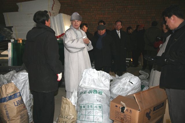 총무원장 자승스님이 평양 덕동 돼지농장을 방문하고, 북측 관계자들의 설명을 듣고 있다. 현재 가동이 중단된 덕동 돼지 농장은 정상적인 가동을 위해 노력하고 있는 상황이다.