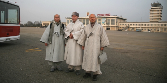 총무원장 자승스님(사진 가운데)이 평양 순안공항에서 사회부장 혜경스님과 해인총림 해인사 주지 선각스님(사진 왼쪽부터)과 함께 기념촬영했다.