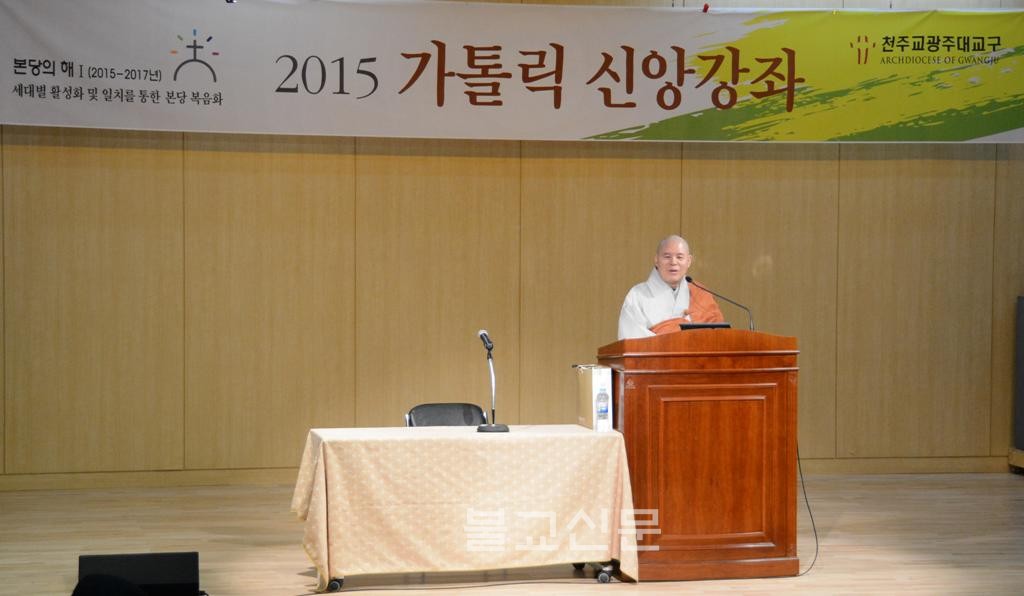 총무원장 자승스님은 2월11일 저녁 광주 가톨릭평생교육원 대건문화관에서 ‘이웃종교에 대한 이해’를 주제로 강연을 했다. 이날 강연은 천주교 광주대교구(교구장 김희중 대주교)가 마련한 ‘2015 가톨릭 신앙강좌’의 일환으로 500여명의 가톨릭 신자가 수강했다.