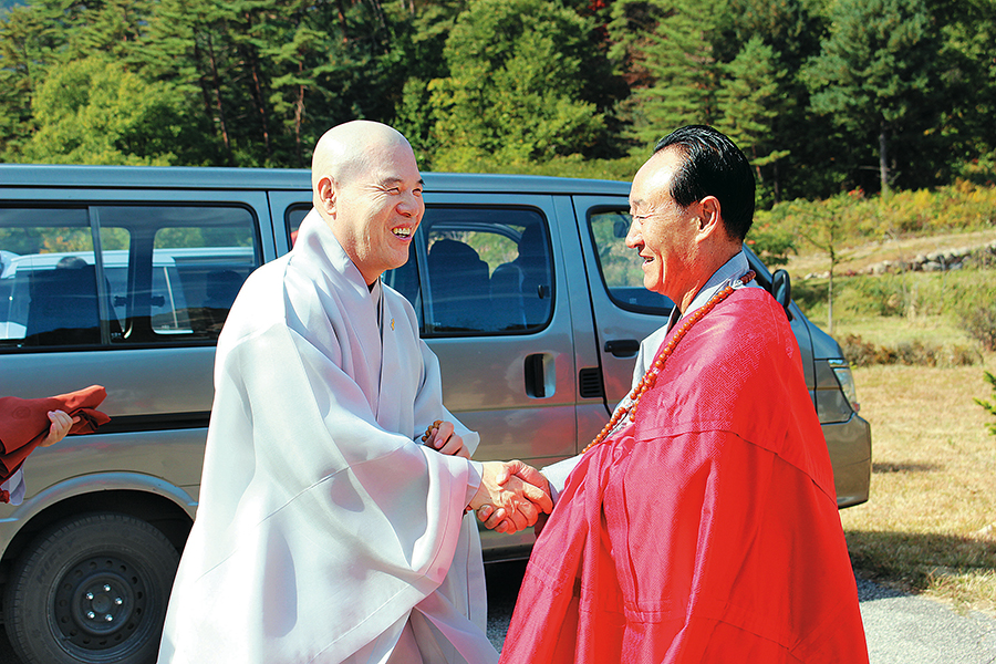 조계종 총무원장 자승스님과 조선불교도련맹 중앙위원회 위원장 지성스님(오른쪽)이 지난 15일 금강산 신계사에서 열린 ‘신계사 낙성 8주년 기념 조국통일기원 남북불교도 합동법회’에 참여하기 전 반갑게 악수를 나누고 있다. 이번 만남은 지난 3월 중국 심양에서 열린 최고위급 대표자 간 회담 이후 두 번째이다.
