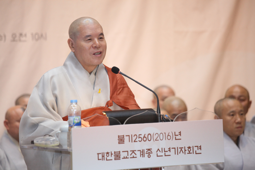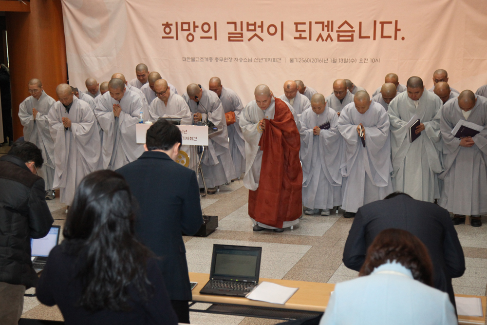 총무원장 자승스님은 13일 한국불교역사문화기념관 1층 로비에서 신년 기자회견을 열고 “요즘 우리사회를 돌아보면 공동체가 아파하는 소리가 여기저기서 들려온다. ‘헬조선’이라는 말이 유행할 정도로 청년 실업문제와 계층 간 격차가 점점 심화되고 있고, 이런 갈등이 사회 곳곳에서 끊이지 않고 있다”면서 “이 과정에서 한국불교 역할이 충분하지 못했던 것에 대해 반성하며, 지혜와 자비심으로 중생의 행복을 위해 정진해 나가겠다”고 강조했다.