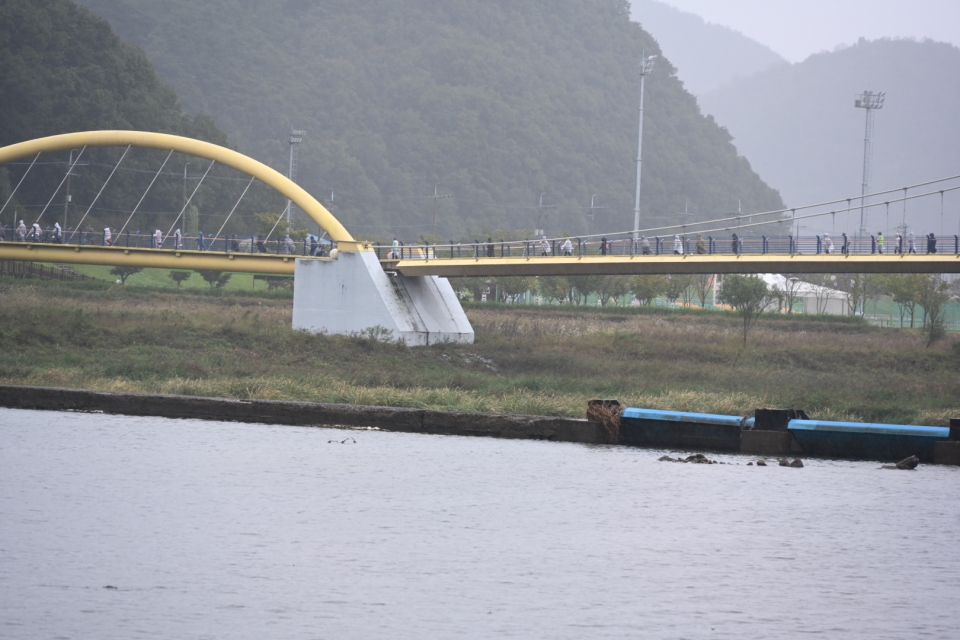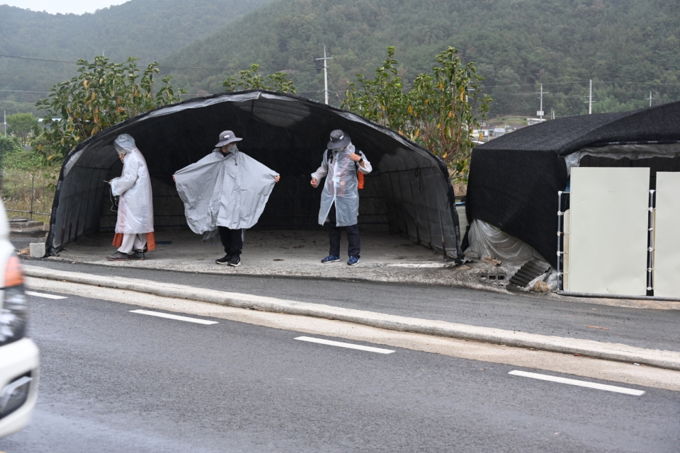 고령군 대가야읍 쾌빈리에서 장기리로 넘어가는 길. 삼보사찰 천리순례 11일차인 10월11일, 우중 행군 속 삼보사찰 중 마지막 사찰인 통도사를 향한 천리순례단의 발걸음에 결연함이 담겼다.