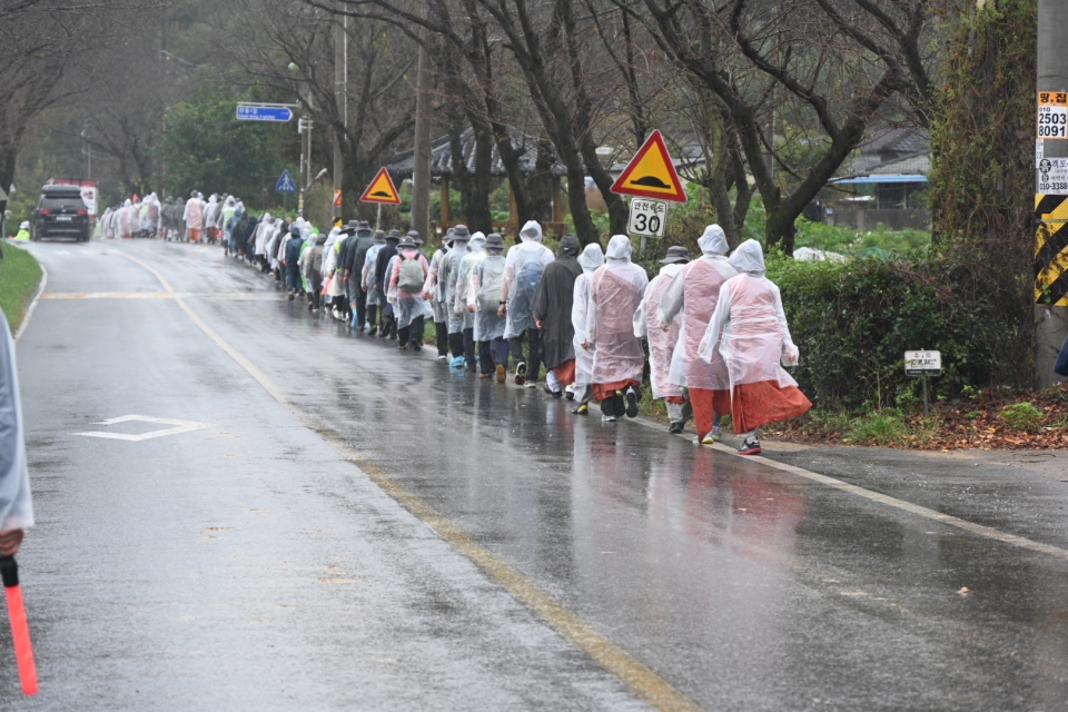 이른 새벽부터 날씨가 심상치 않더니 우려가 현실이 됐다. '투둑투둑' 천막 텐트를 잔잔하게 때리던 빗줄기는 이내 굵어져 시야를 가렸다. 앞이 보이지 않을 만큼 쏟아 붓는 빗줄기에 순례단 발걸음이 멈칫했다. 개인 지참 필수품이던 우비를 미처 챙기지 못한 이들에게 일회용 우비가 지급되면서 재정비를 마친 순례단이 다시금 출발선에 섰다.