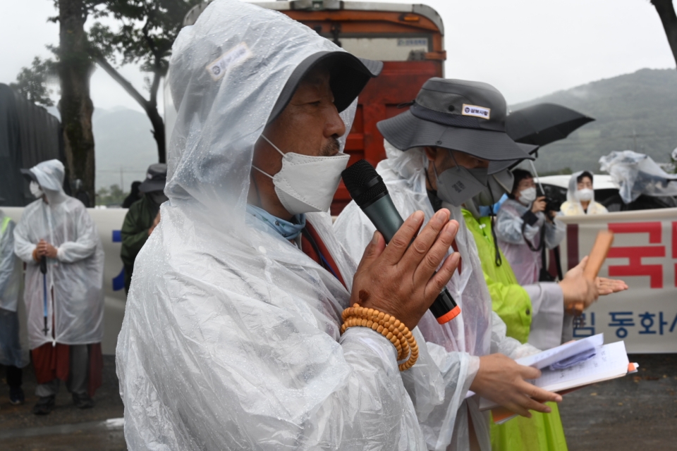 우중 행선 속 저마다의 고투를 벌이는 와중에도 경쾌한 농담은 오고갔다. 출발 5km가 지난 지점, 정비를 위해 잠시 주어진 휴식시간. 선광스님이 비에 젖지 않게 신발 위 발목을 검은 비닐로 칭칭 감으며 “씻지도 못했는데 빗물로 세수를 하니 좋다”고 호탕하게 말하자 여기저기서 ‘말과 행동이 다르다’며 웃음보가 터졌다.