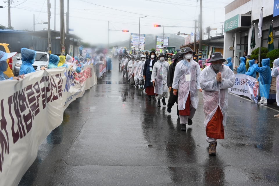 정비를 마친 순례단은 다시금 길가로 나와 너른 벌판을 걸었다. 노랗게 익은 벼가 빽빽이 들어찬 논 길, 하천을 따라 예쁘게 길을 낸 산책길 외에도 위험한 차도를 따라 행선했다. 차들이 쌩쌩 지나며 매캐한 냄새와 소음을 뿌리던 길바닥 8개 조 중 맨 뒤에서 두 번째 대열 제일 앞에 선 상월선원 만행결사 회주 자승스님은 역시나 말이 없다. 젖은 신발과 비옷을 툴툴 털어버린 채, 빗속에서도 환히 웃는 순례단을 지켜볼 뿐이다.