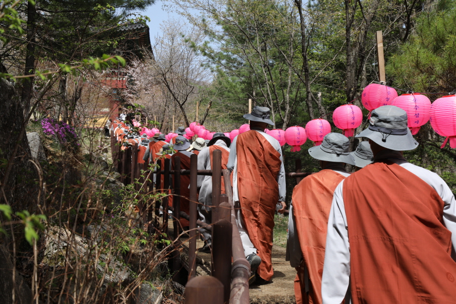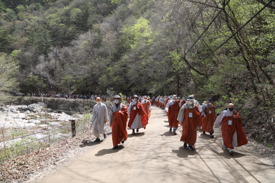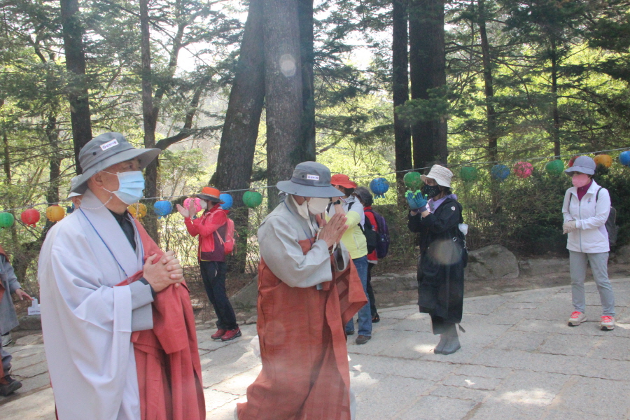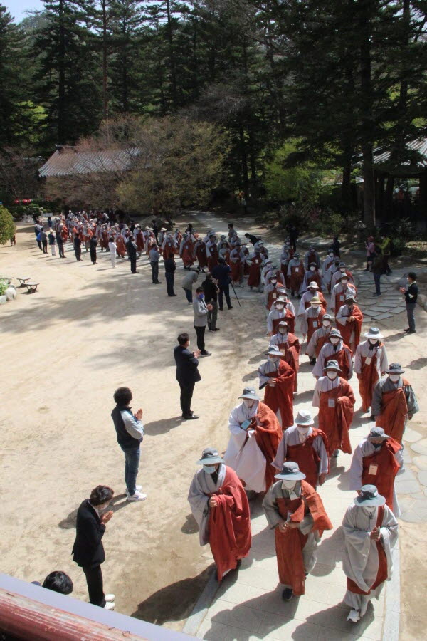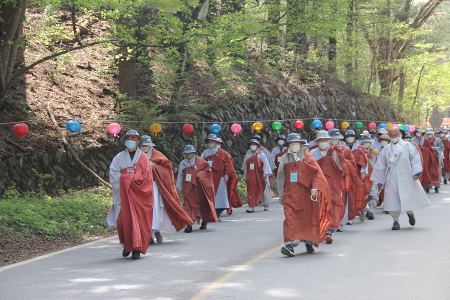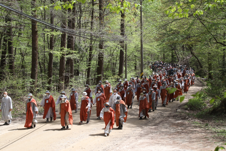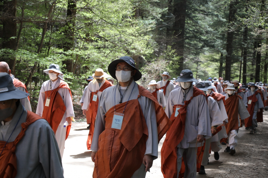 스님 300여명, 재가불자 1200여명. 이번 순례의 규모는 올해 들어 가장 많은 인원이다. 사회적 거리두기가 대부분 해제되면서 그동안 방역지침을 준수하기 위해 참여를 자제해왔던 불자들이 전국 각지에서 찾아온 것이다. 3월 대흥사의 500명에 비하면 3배 규모. 하지만 대규모 순례객들은 모두 마스크를 착용하고 묵언한 채 방역지침을 준수하면서 순례길의 안전과 질서를 스스로 지켰다.