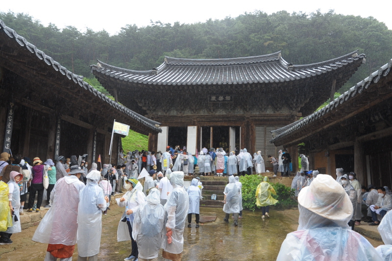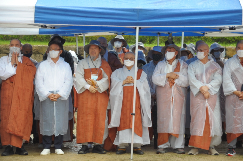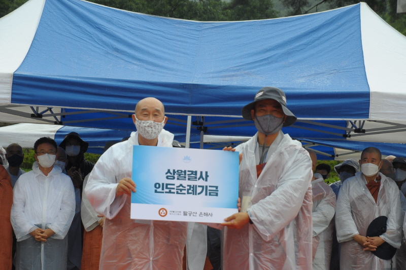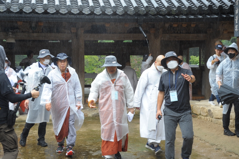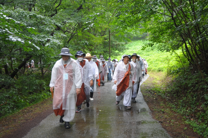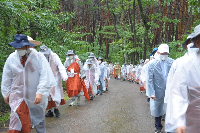 입재식을 마친 뒤 상월결사 회주 자승스님을 필두로 1600여 명의 사부대중은 본격적인 순례에 돌입했다. 무더위를 날린 이른 가을비 속에서도 코로나19 방역수칙을 준수하기 위해 마스크 쓰고 우의를 입은 채 굵은 땀방울을 흘리며 묵언 순례를 이어갔다.