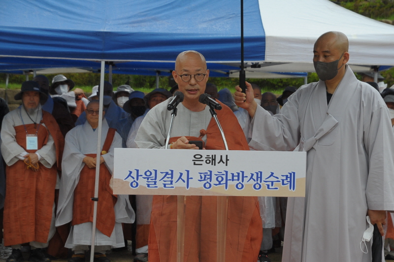 상월결사 순례동참자들은 발원문 낭독을 통해 이날 순례의 의미와 각자의 서원을 되새겼다. 박봉규 은해사 신도회장이 대표로 낭독한 발원문을 통해 “강하고 약한 나라 모두가 분별과 차별이 없는 평화의 서원을 의지해 향기로운 정토로 나가는 마음의 평화방생을 원만 성취해 주소서”라고 서원했다.