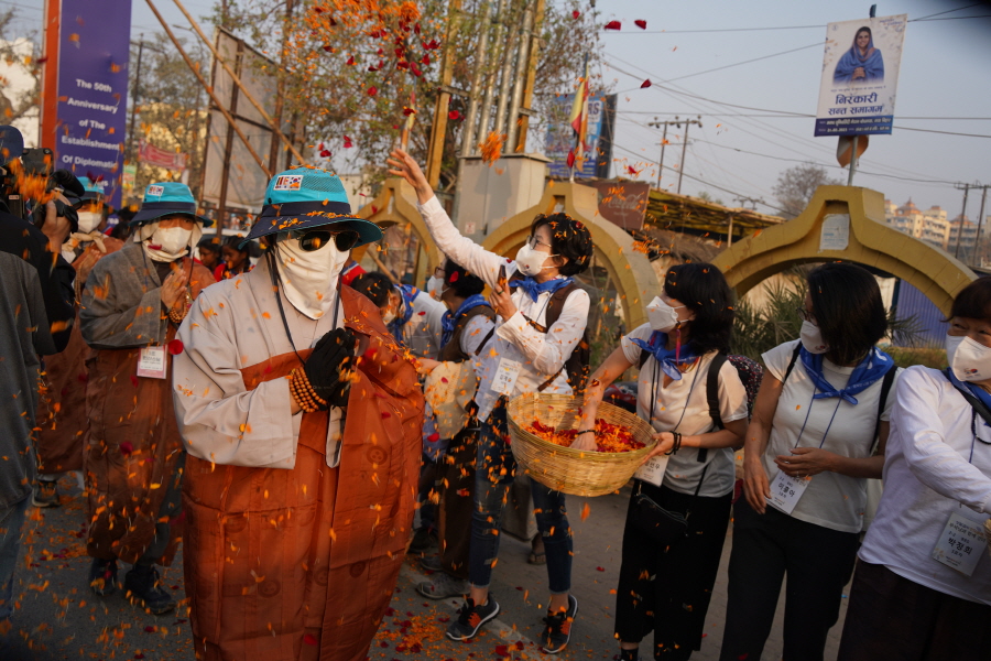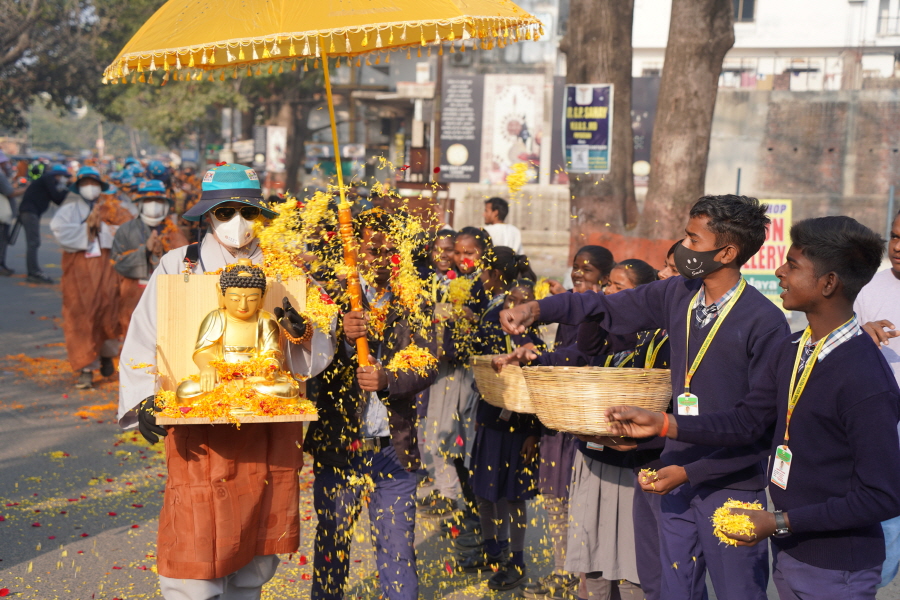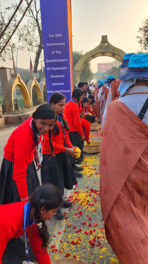 이날 오전10시 무렵 보드가야 시내로 들어온 순례단은 대보리사 2km 앞에서 한국에서 온 스님과 불자들의 열렬한 환호를 받으며 성지로 향했다. 악대가 길을 내고 가사를 수한 스님들이 100m가량 안행(雁行)으로 뒤를 잇고, 한국에서 온 스님과 불자들이 따르는 순례단 행렬은 보드가야를 찾은 세계 불자들의 이목을 끌기에 충분했다.
