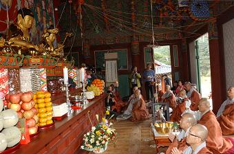 <사진설명> 금강산 신계사 낙성법회에 참석하기 위해 금강산을 방문한 조계종 총무원장 지관스님 등 남측 불교계 일행은 낙성에 앞서 11일 오후 신계사 대웅보전에서 부처님 봉안 및 점안식을 거행하고 있다. 금강산=신재호 기자