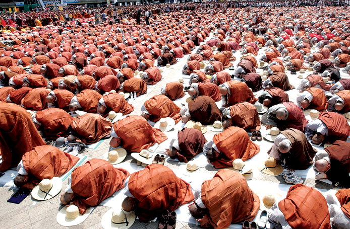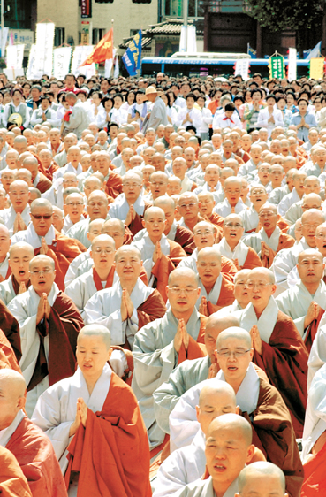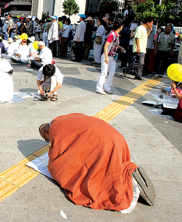 전국에서 참석한 1만여 스님들이 호궤합장을 한 채 참회진언을 낭송하고 있다(왼쪽).  오른쪽은 덕수궁 대한문 앞에서 종교화합과 국민통합을 발원하며 108참회를 하고 있는 스님 모습.