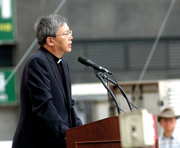 이웃종교인인 김광준 신부(사진 왼쪽)가 참석해 현 정부의 종교차별 행위를 규탄하는 연대사를 했다. 오른쪽은 불교신문이 뉴스서비스를 하고 있는 시청 오른편의 전광판. 이번 대회를 생중계했다.