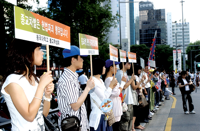 ▲동국대 불교학생회 등 교계단체들이 거리에서 시민들에게 정부의 종교차별 부당성을 홍보하고 있다.